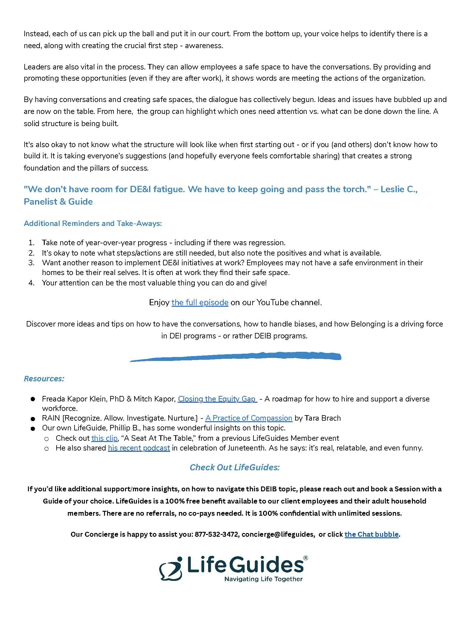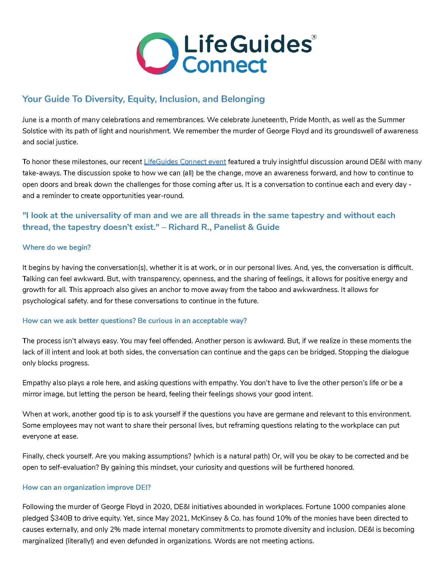 “Thank You for extending our Connect brand & webinar into such well-written, thought-provoking newsletters and easy reference 1-pagers. I even find myself asking these self-care questions.”