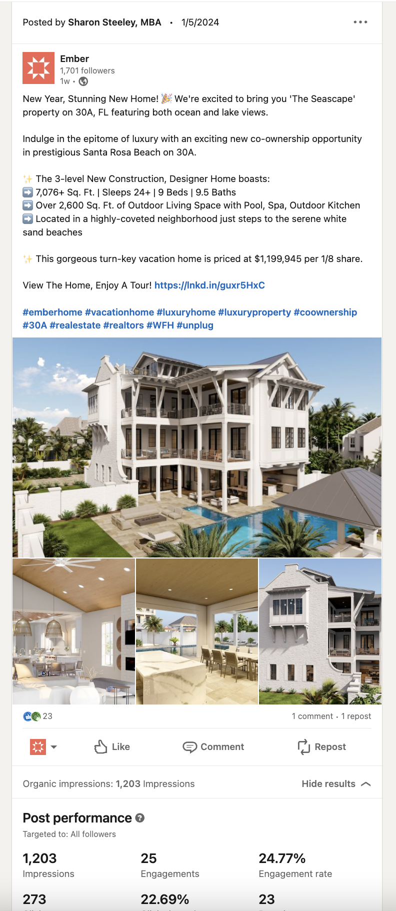 Goals included: consistent, on-brand posts & elevated copy to align with luxury vacation home company, along with increased employee engagement on LinkedIn (almost nil to date).